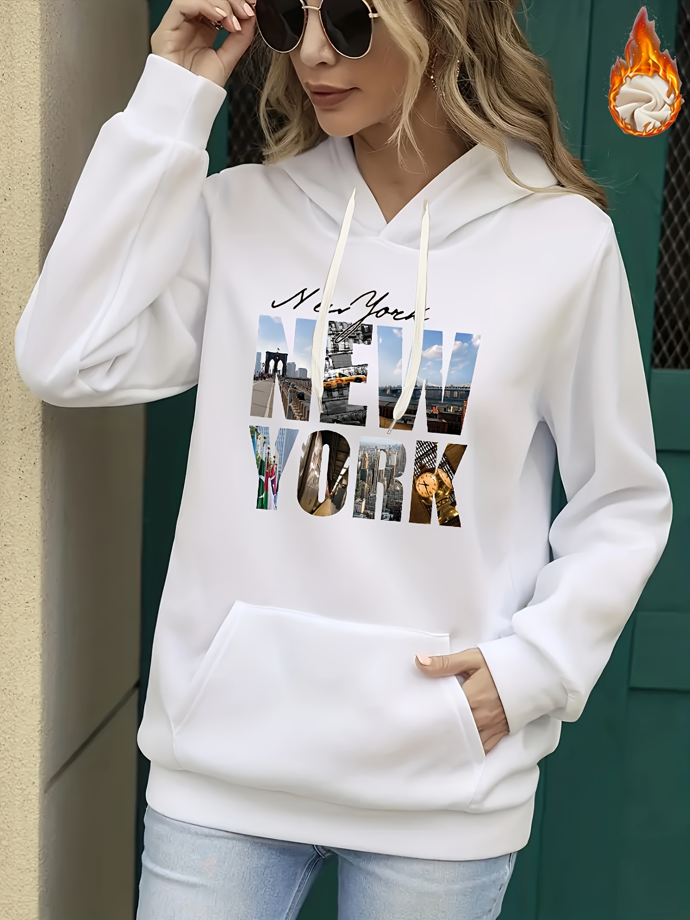 White New York Letter Graphic Fleece Lined Hooded Sweatshirt