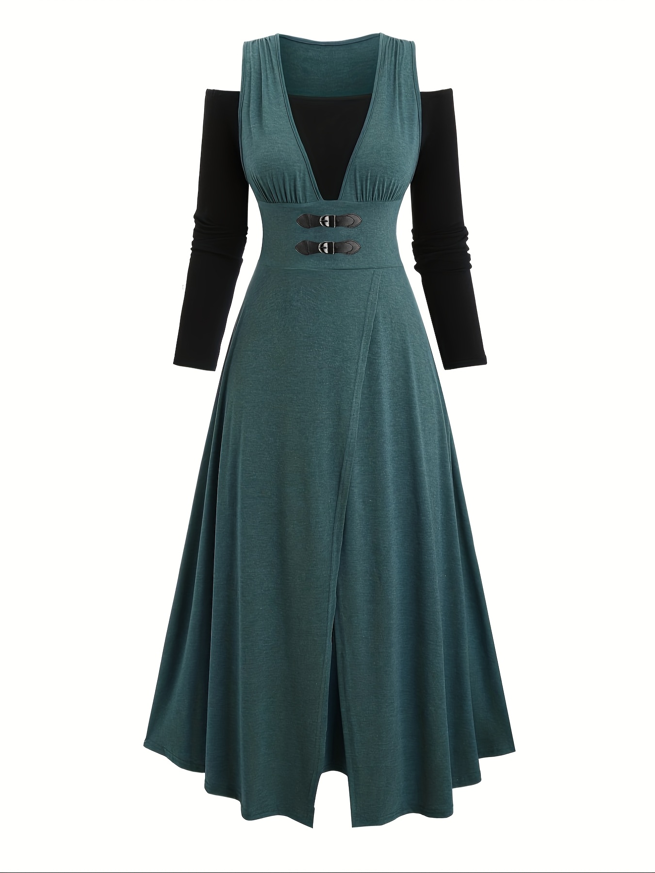 Plus Size – Plus Size – Plus-Size Women’S Elegant Solid Color Long-Sleeve Collared Coat And V-Neck Dress Set