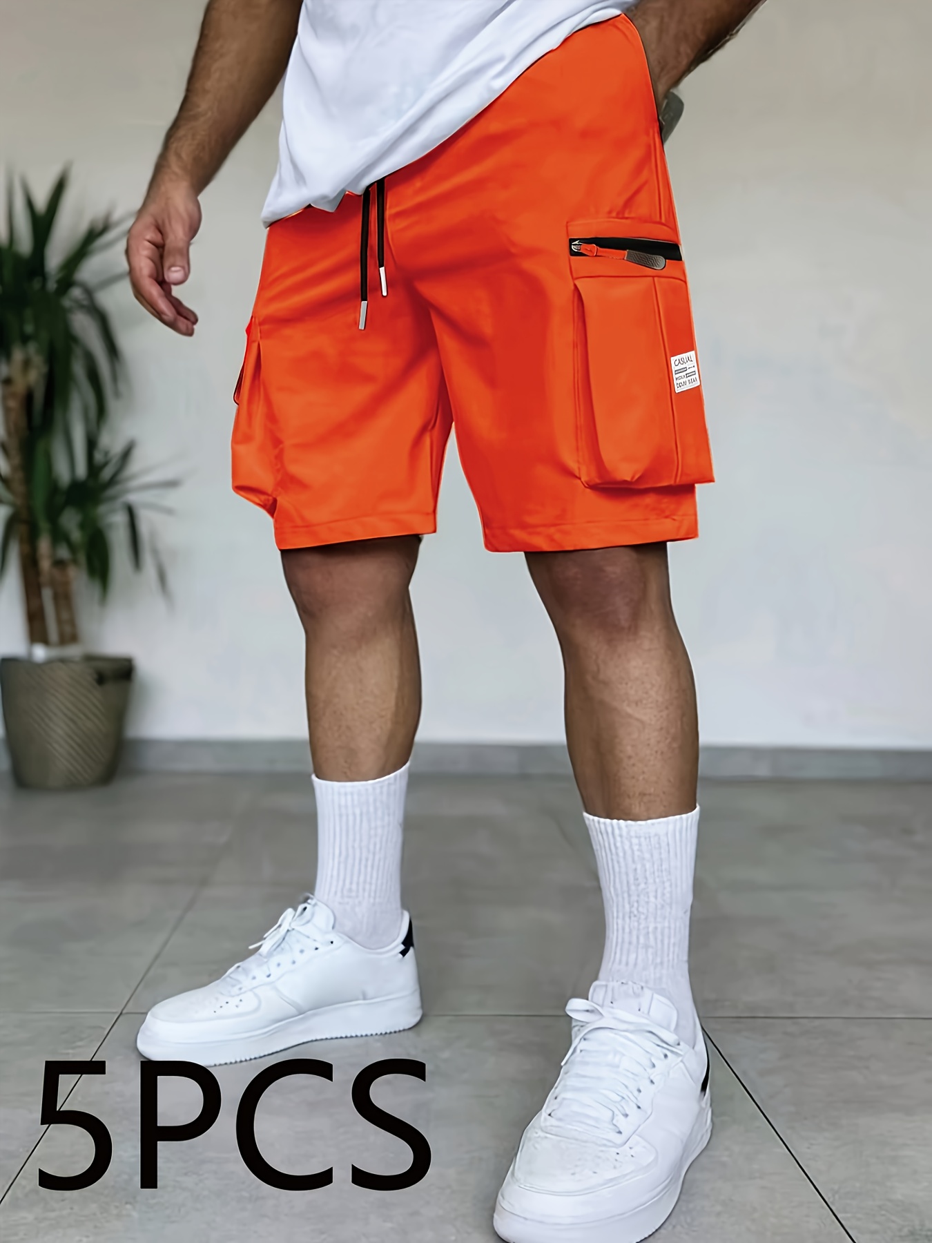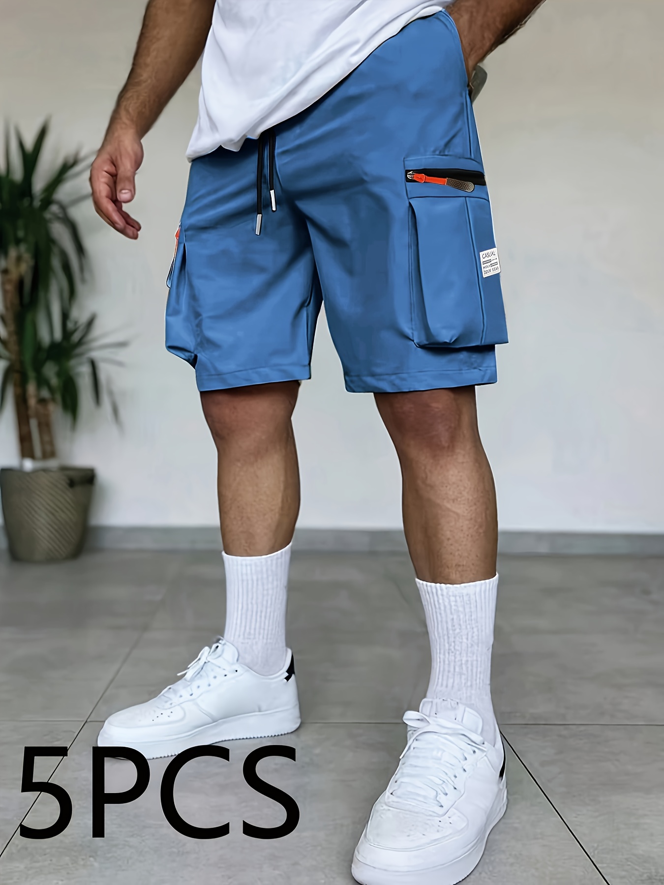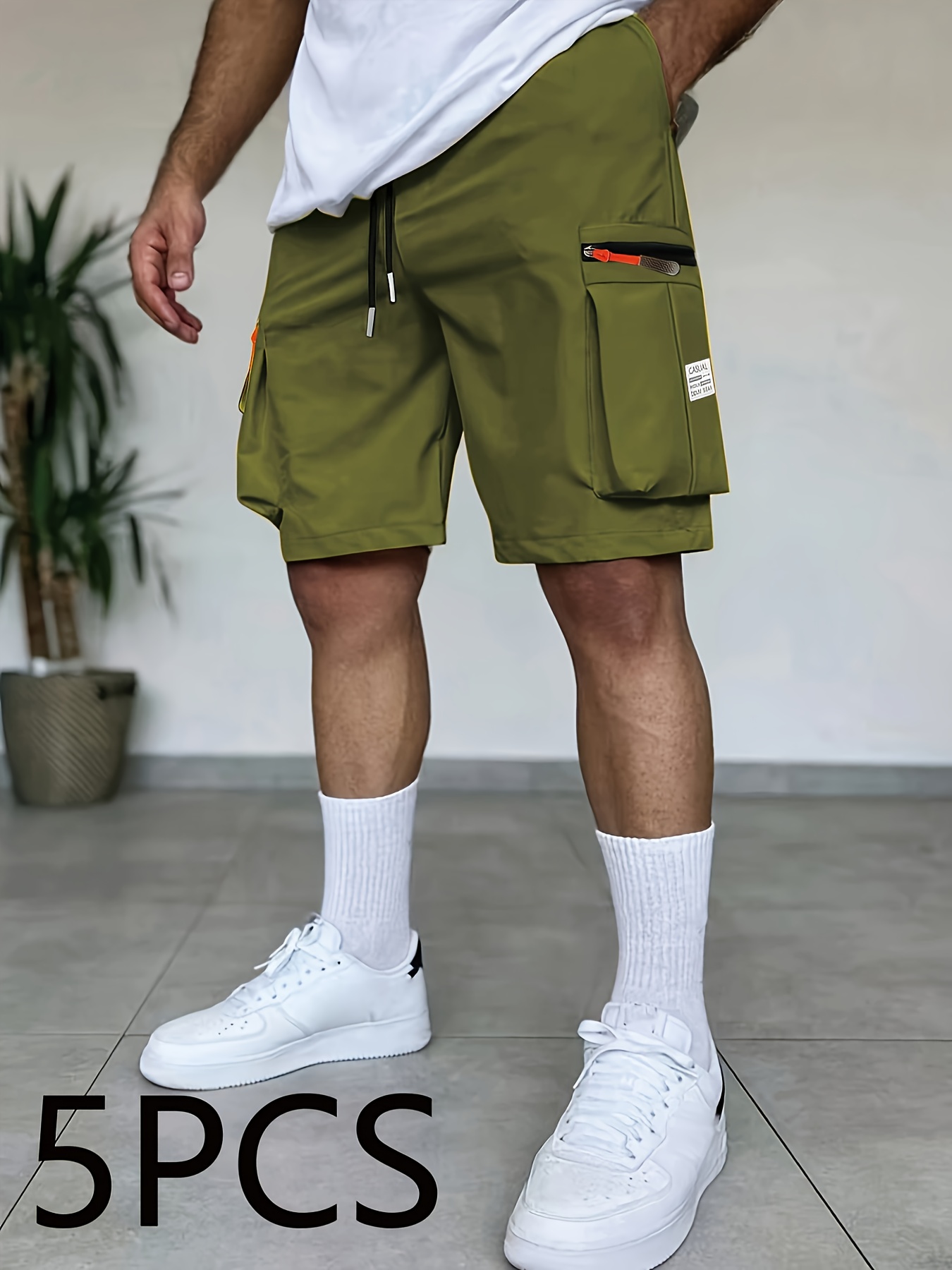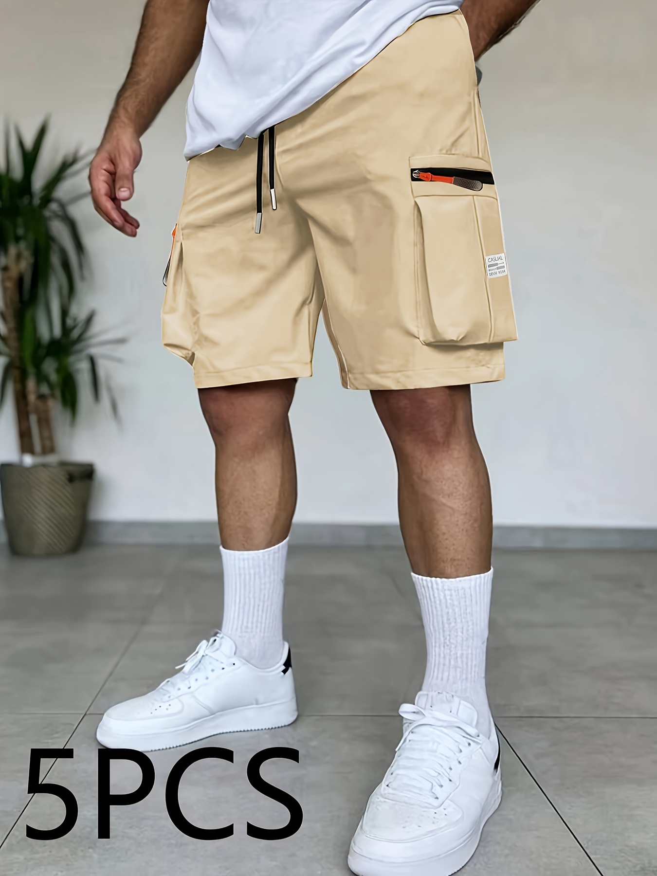 5-pack men’s straight-leg work shorts with zipper design. Loose fit polyester shorts in retro summer casual style for everyday wear.