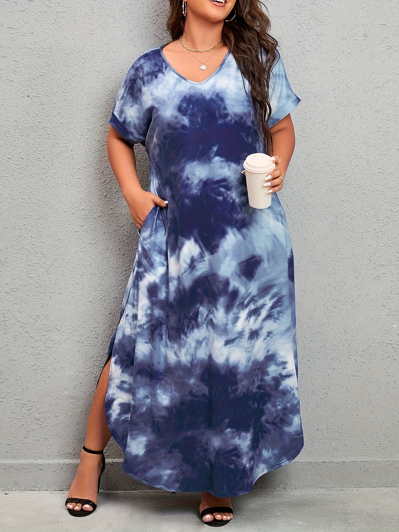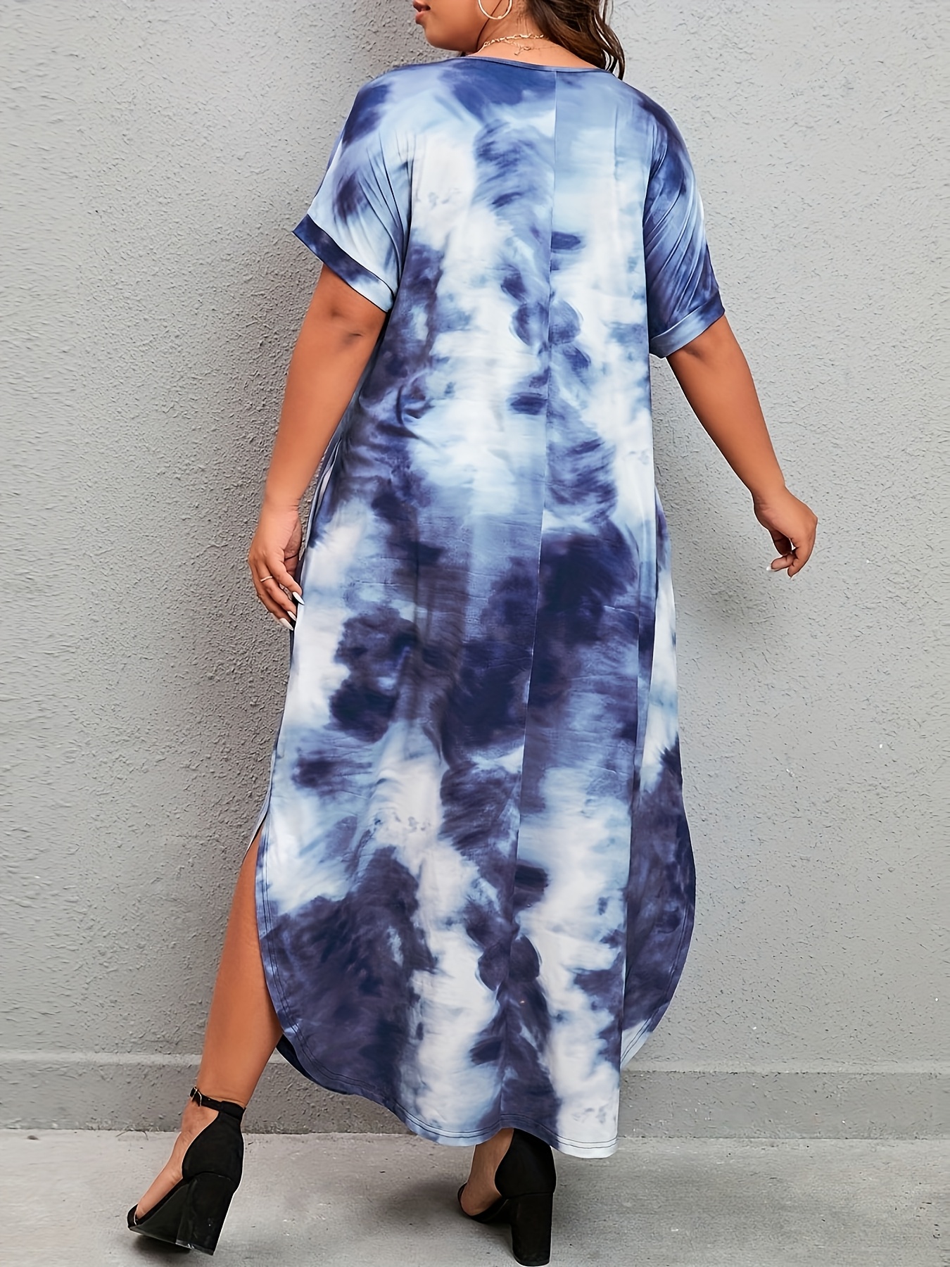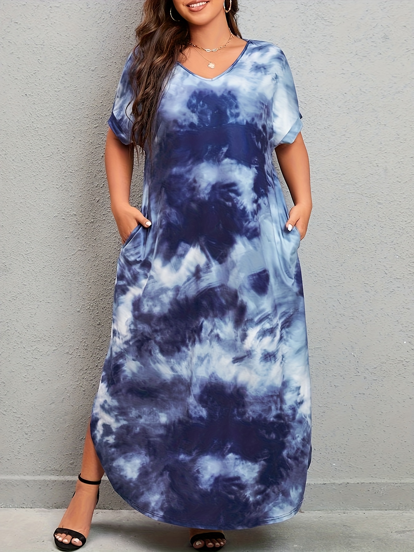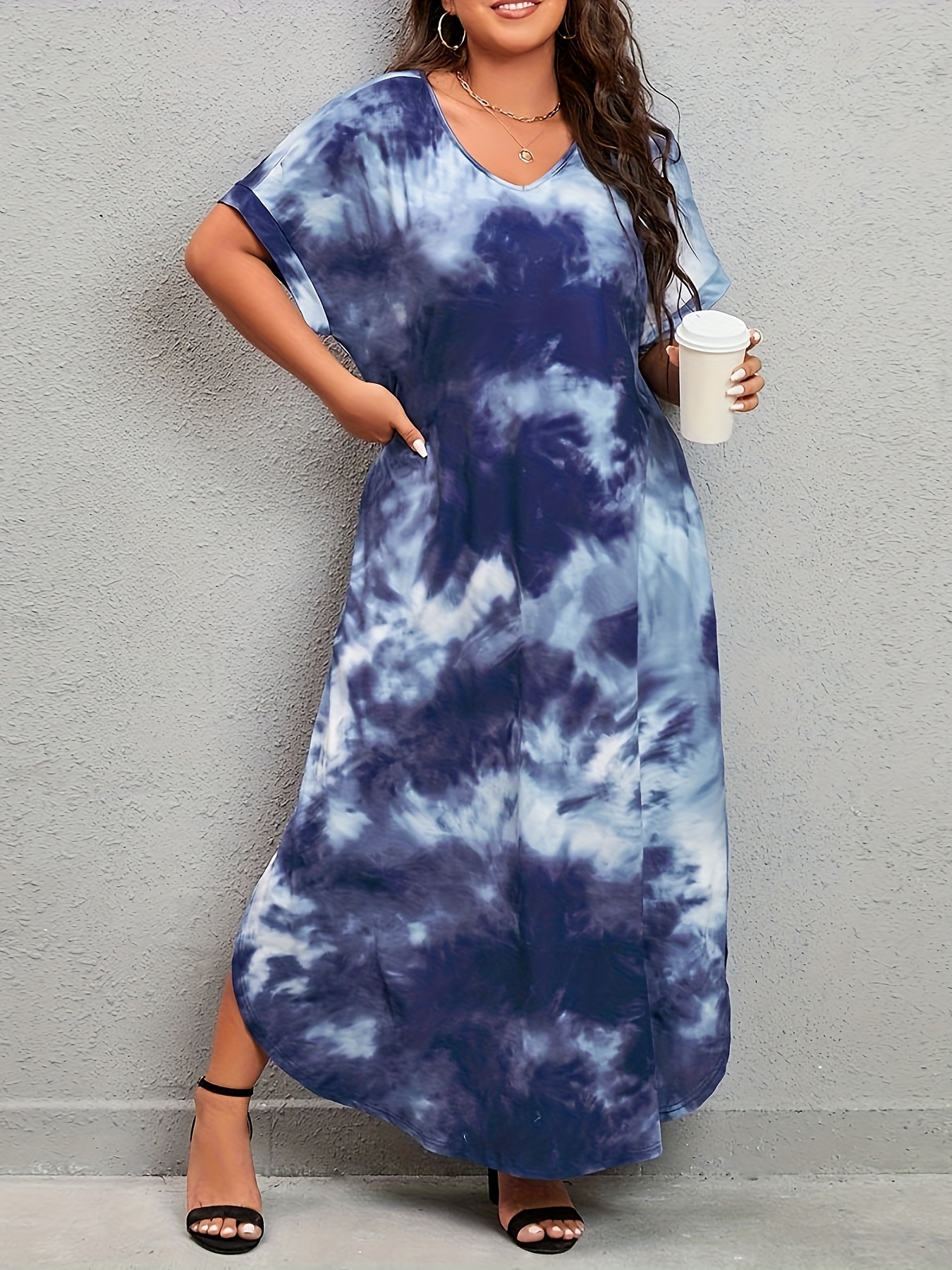 Blue Plus Size Women’s V-Neck Short Sleeve Dress – Abstract Print Tunic, Loose Fit, Casual to Dressy Outfit for Spring Summer Fall
