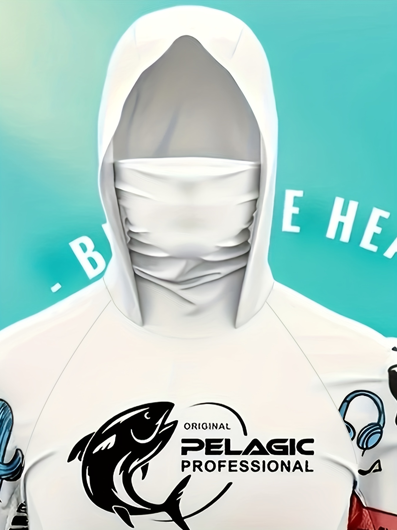 Unisex fishing mask hooded sweatshirt with slim fit, breathable polyester fabric, and geometric print. Perfect for outdoor sports, hunting & fishing.