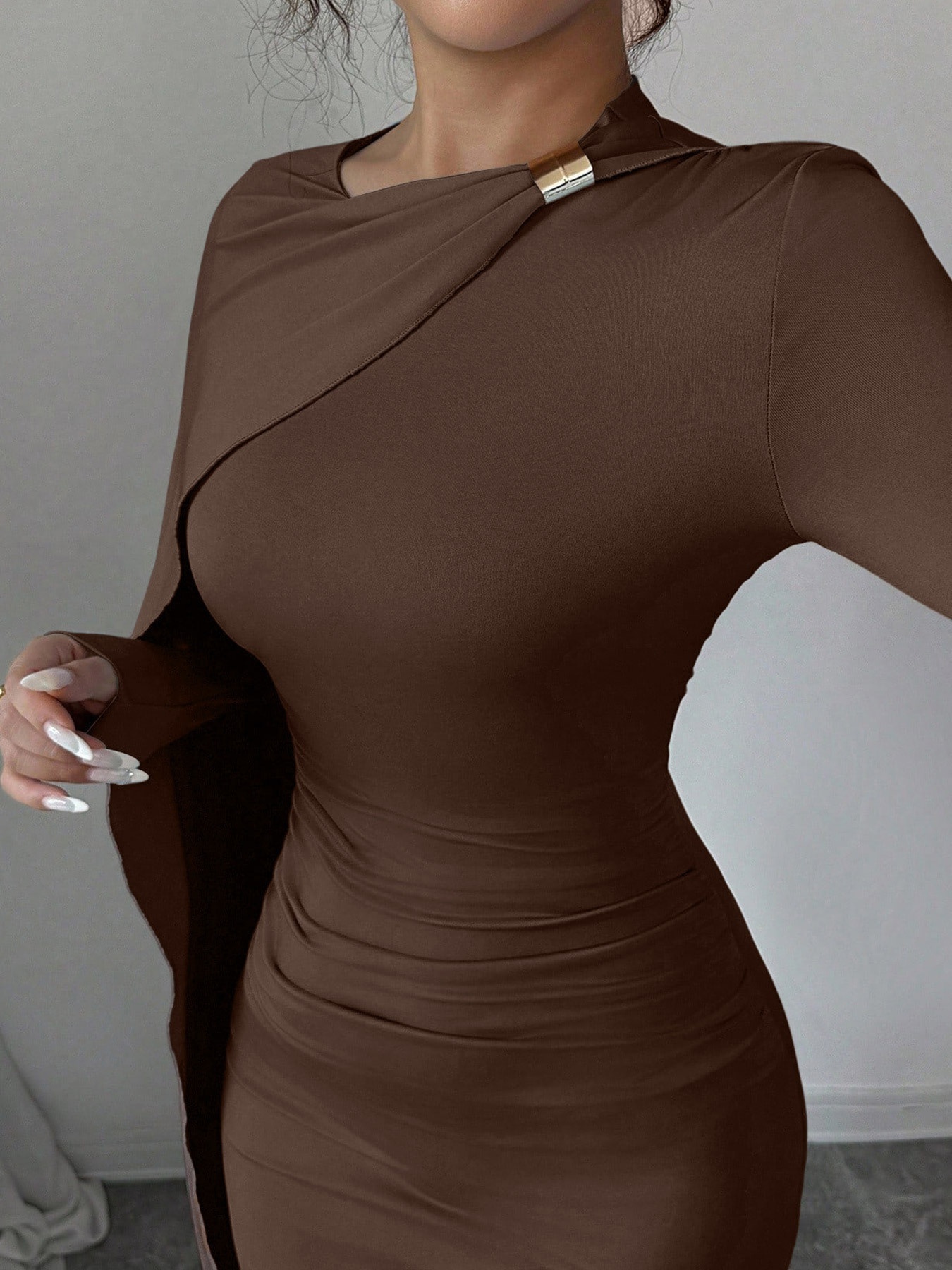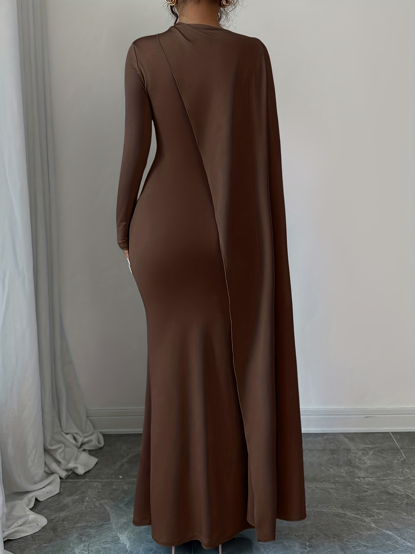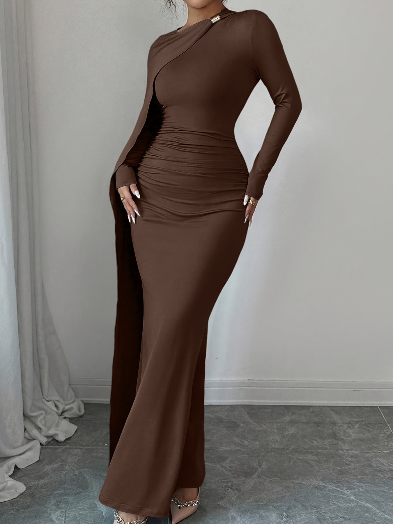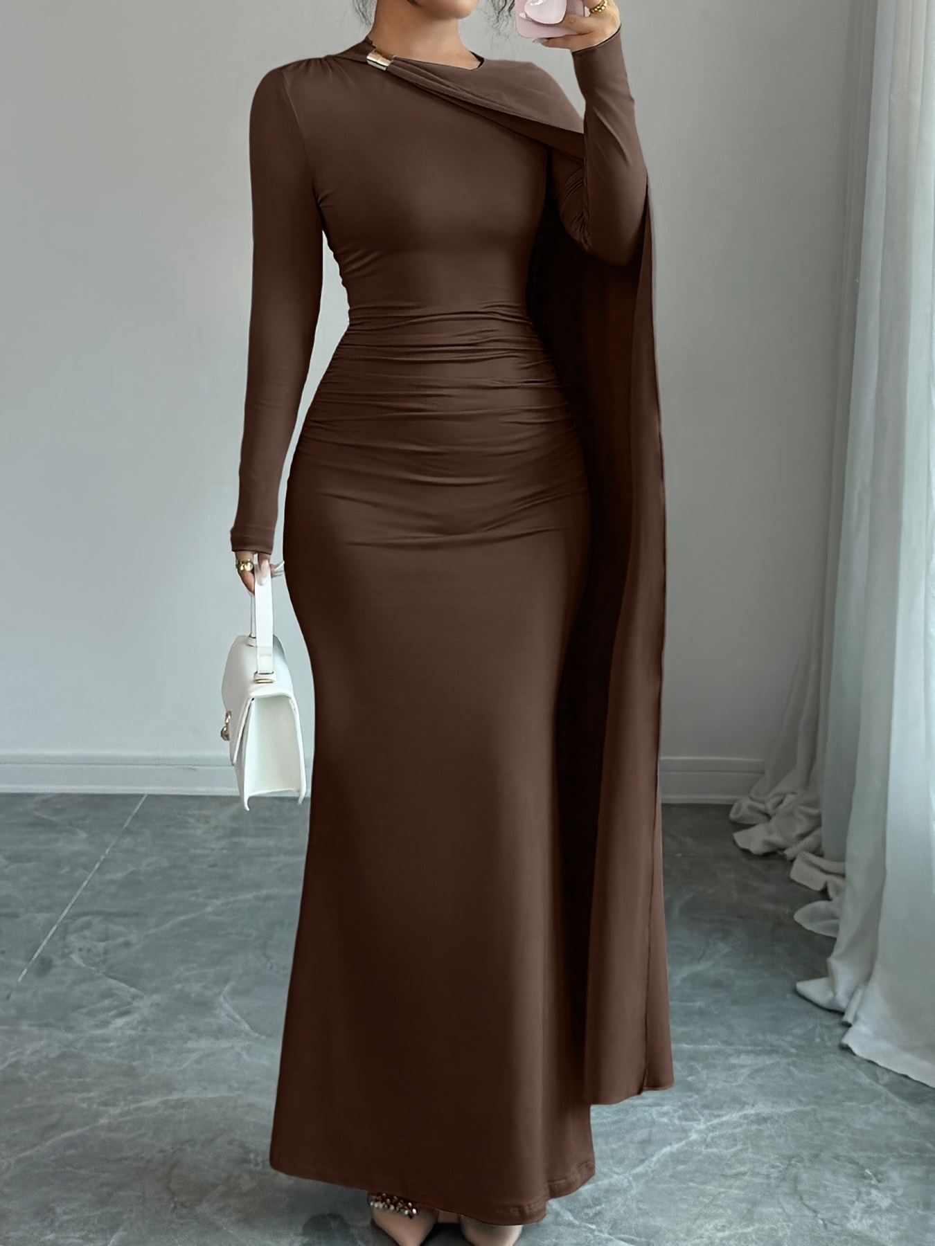 Long-Sleeved, Brown, Pleated Waist Dress for Autumn, Featuring an Asymmetrical Draped Tassel Design, Suitable for Formal Parties And Dinners