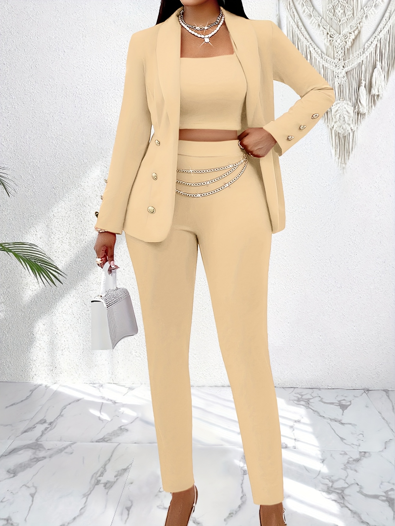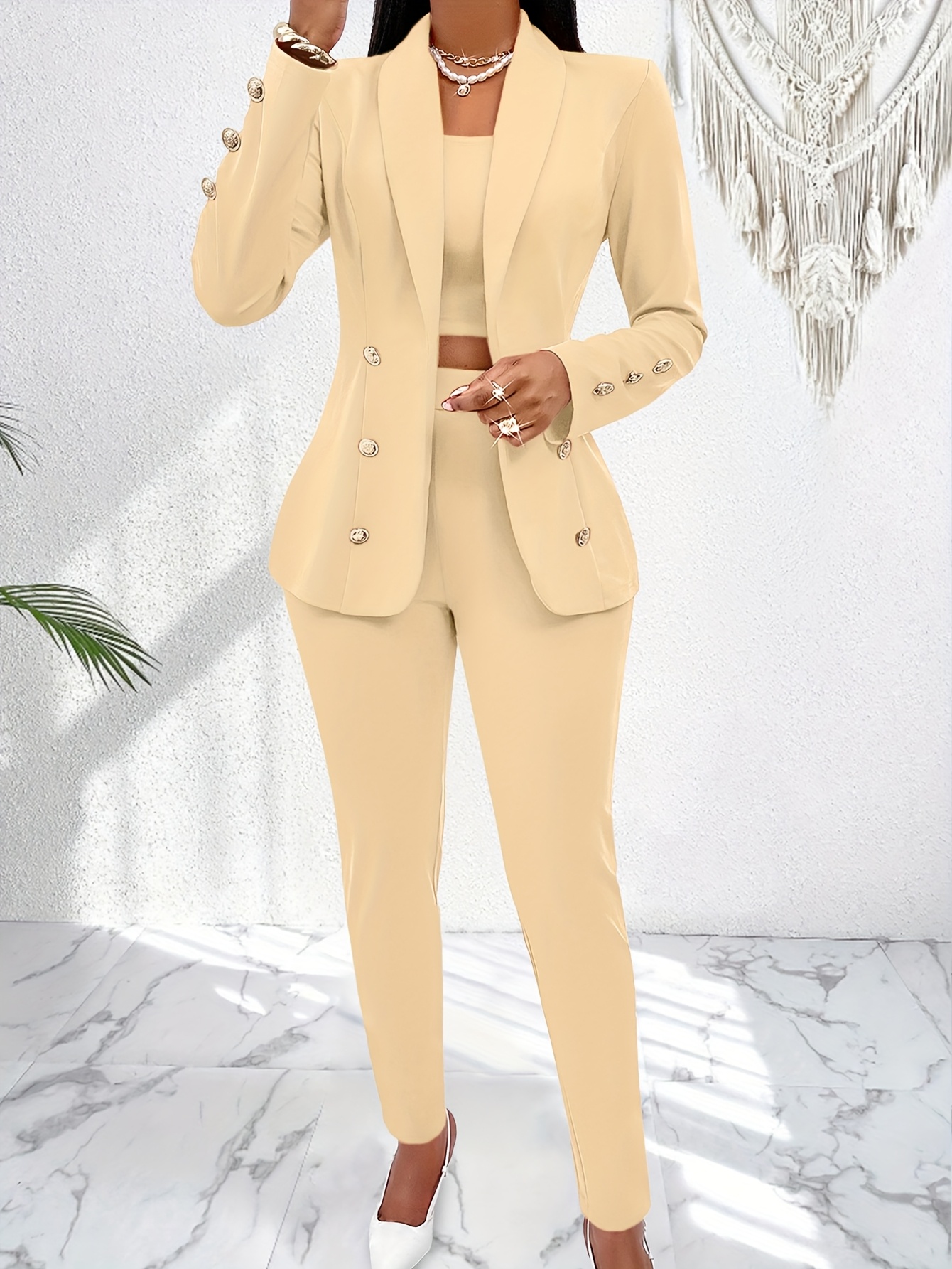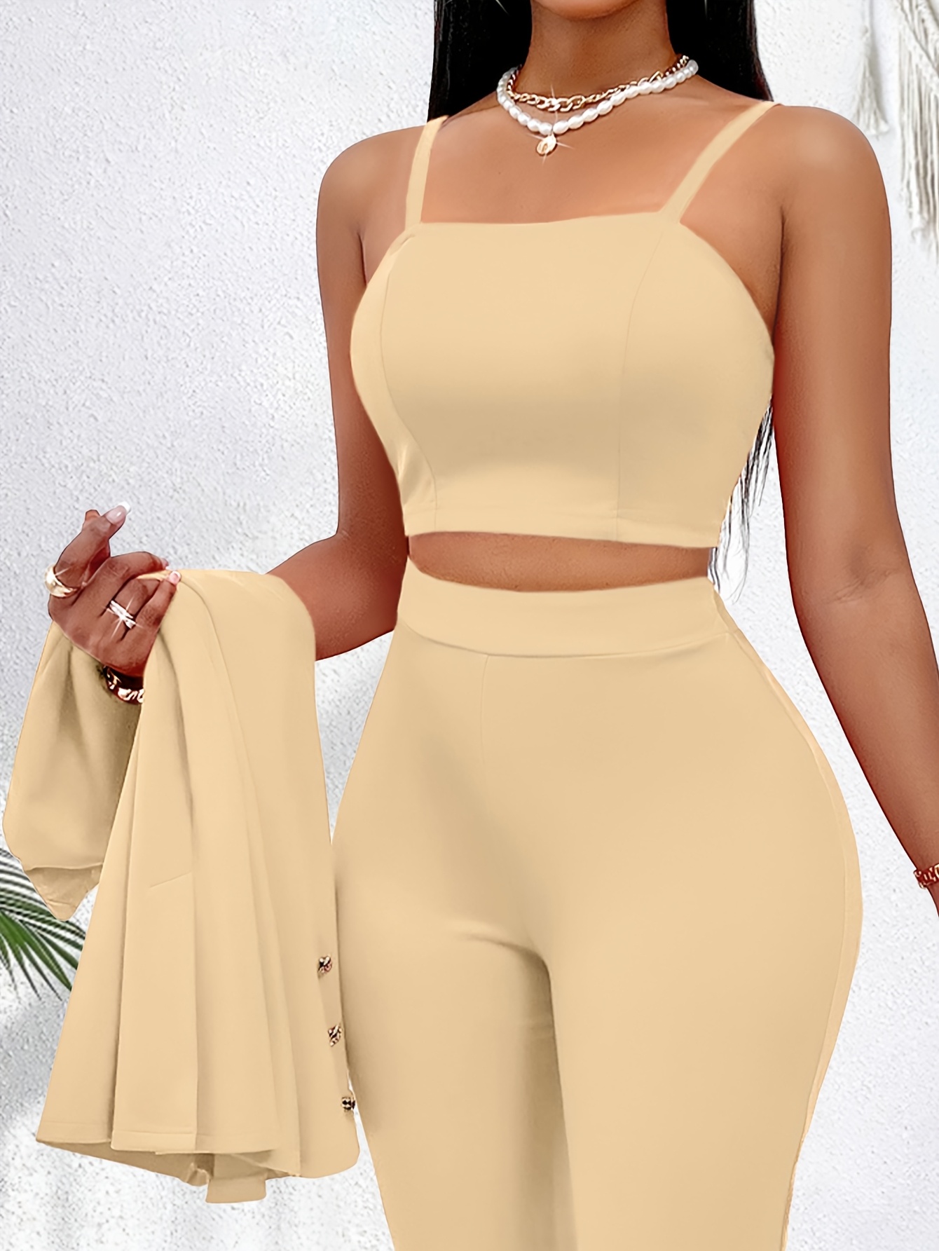 New Women’s Premium Set: Camisole Top with Spaghetti Straps and Shawl Collar Open Front Blazer Cardigan Top & Trousers 3pcs Suit, Suitable for Office Looks, Daily Commutes, Wedding Season Outfits, and Important Occasions