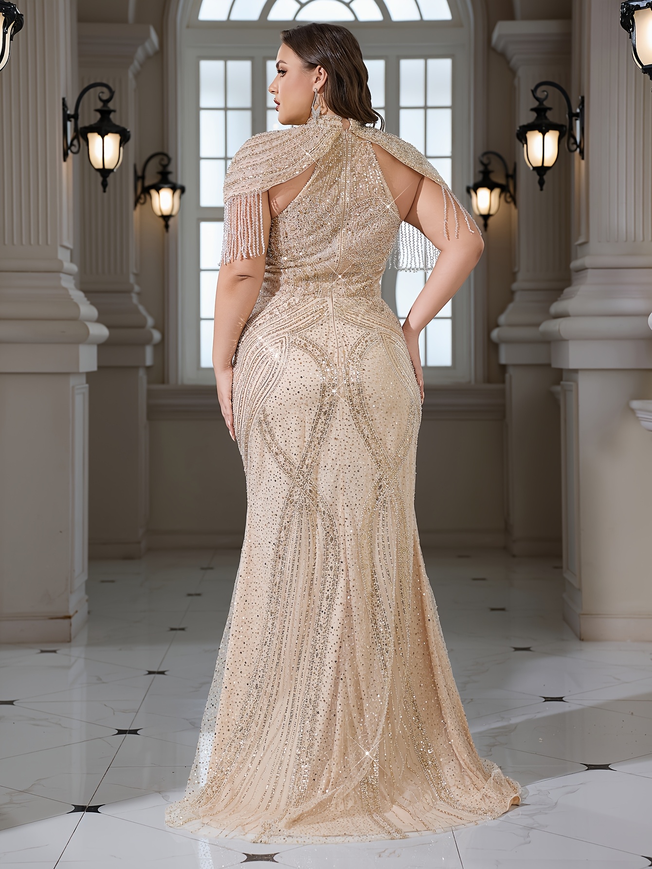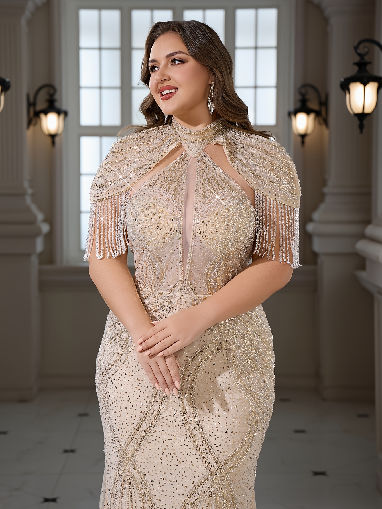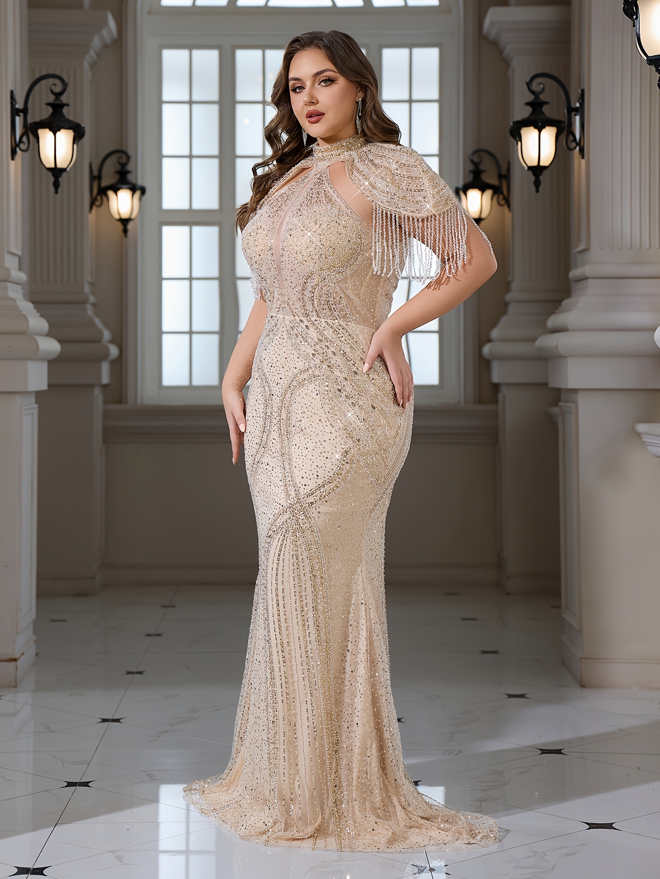 Plus Size – Luxury Sequined Tassel Bodycon Gown | Floor-Length, Mermaid Silhouette, Half Placket, Non-Stretch Fabric, Ideal for Wedding and High-End Banquets