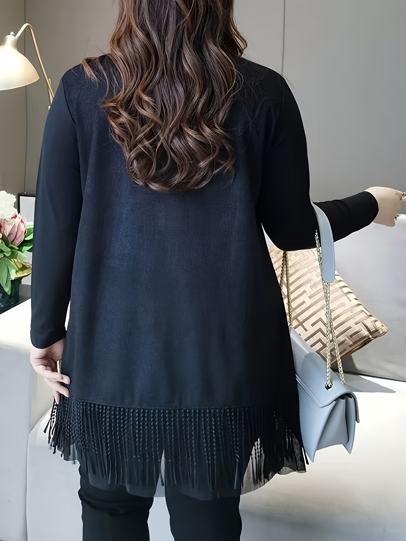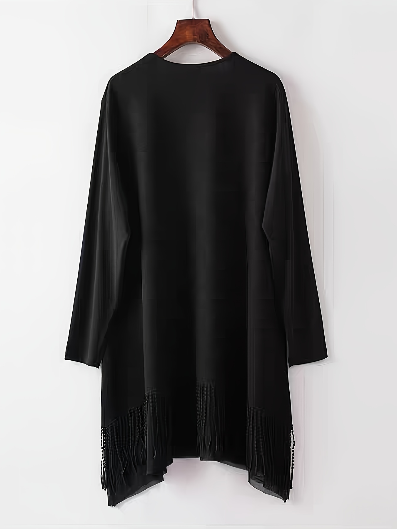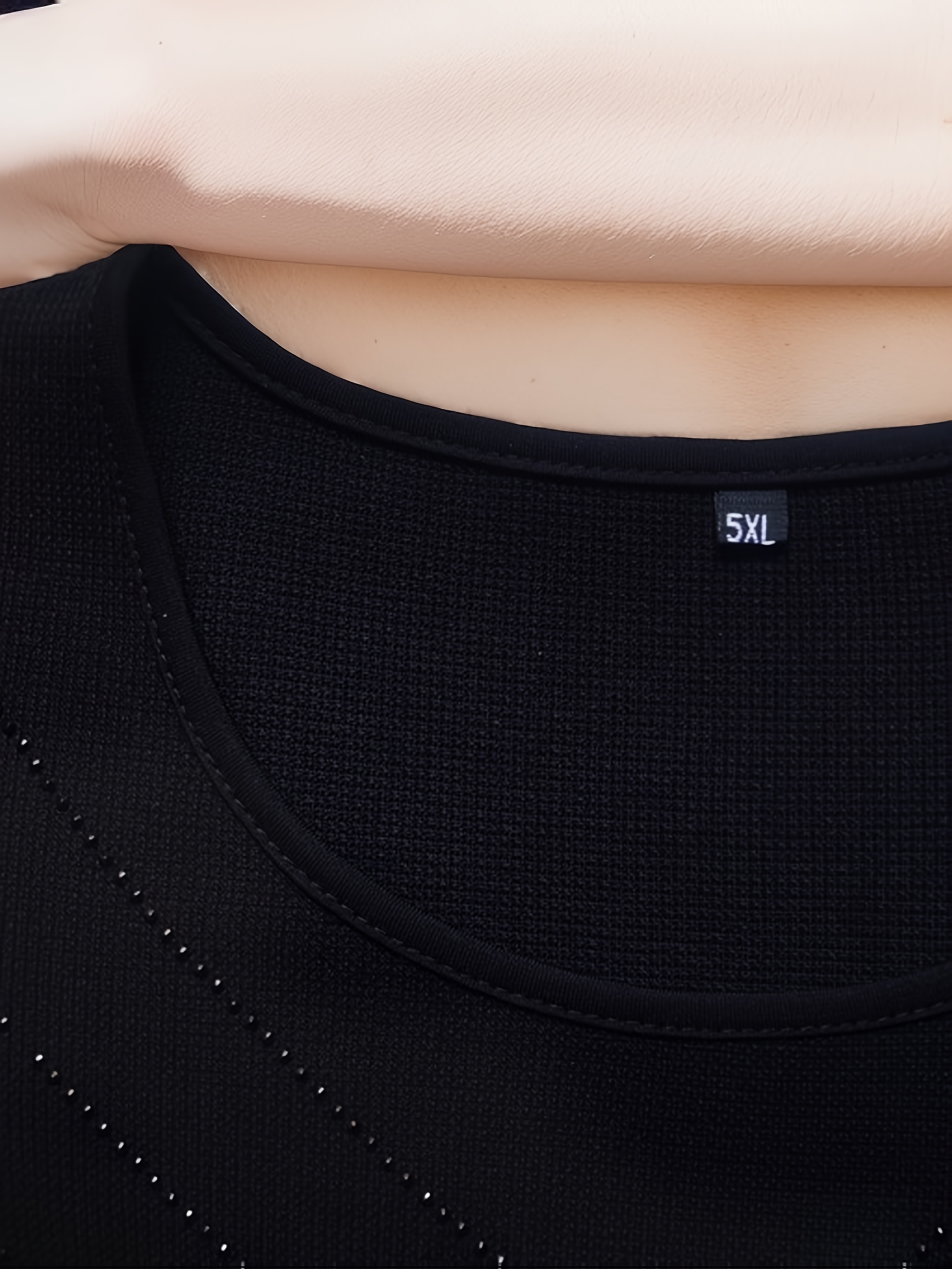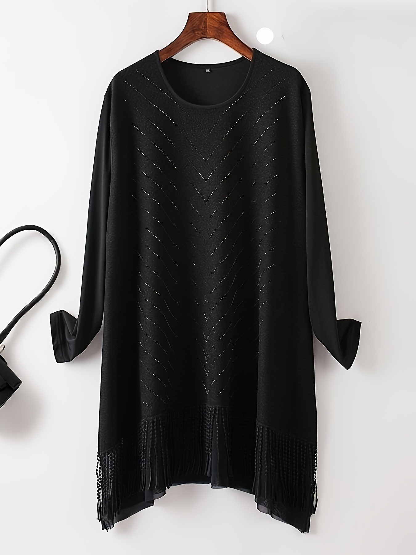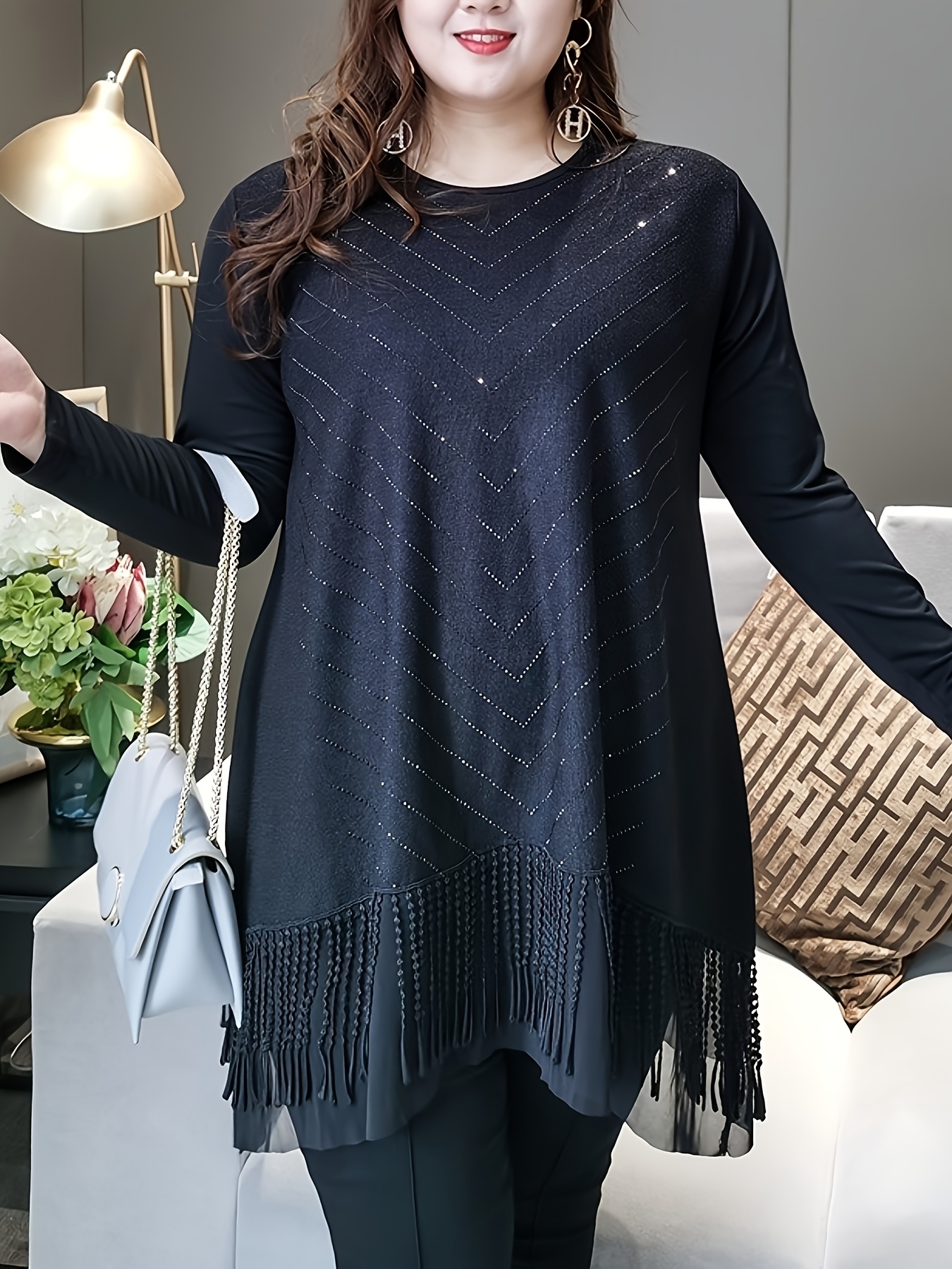 Plus Size, New Arrival for Spring/Summer 2026, Commuter Style, Elegant Embroidered Tassel Hem with Mesh Panel, V-Shaped Rhinestone Appliqué, Black, Round Neck, Long Sleeves, Regular Stretch Sleeves, A-Line Cut, Fashionable and Simple Plus-Size