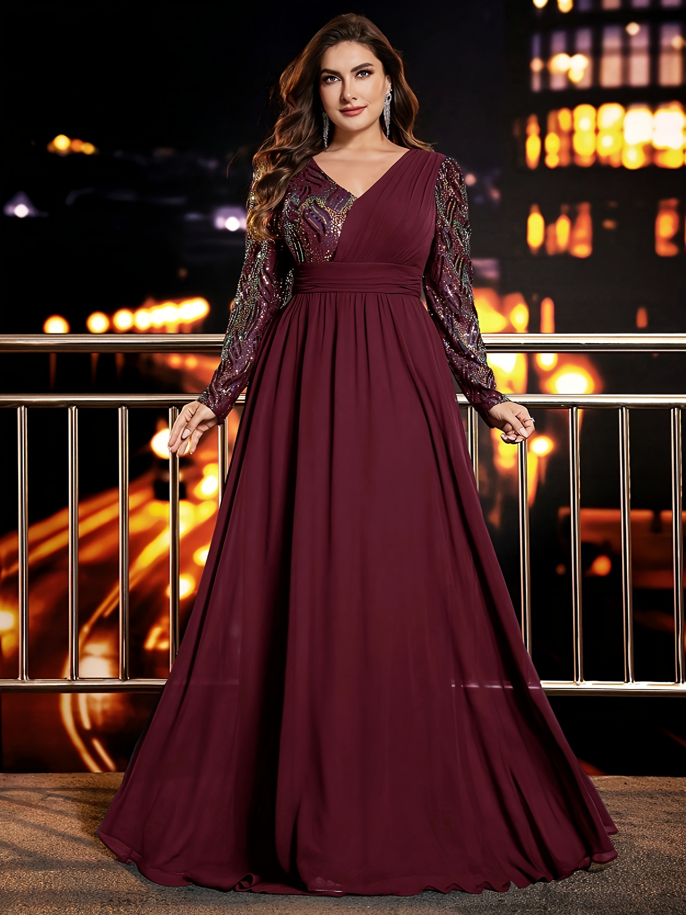 Plus Size – Plus Size – Plus-Size Sequin Chiffon Dress with V-Neck Long Sleeves, A-Line Style, Perfect for Weddings, Evening Parties, And Formal Occasions