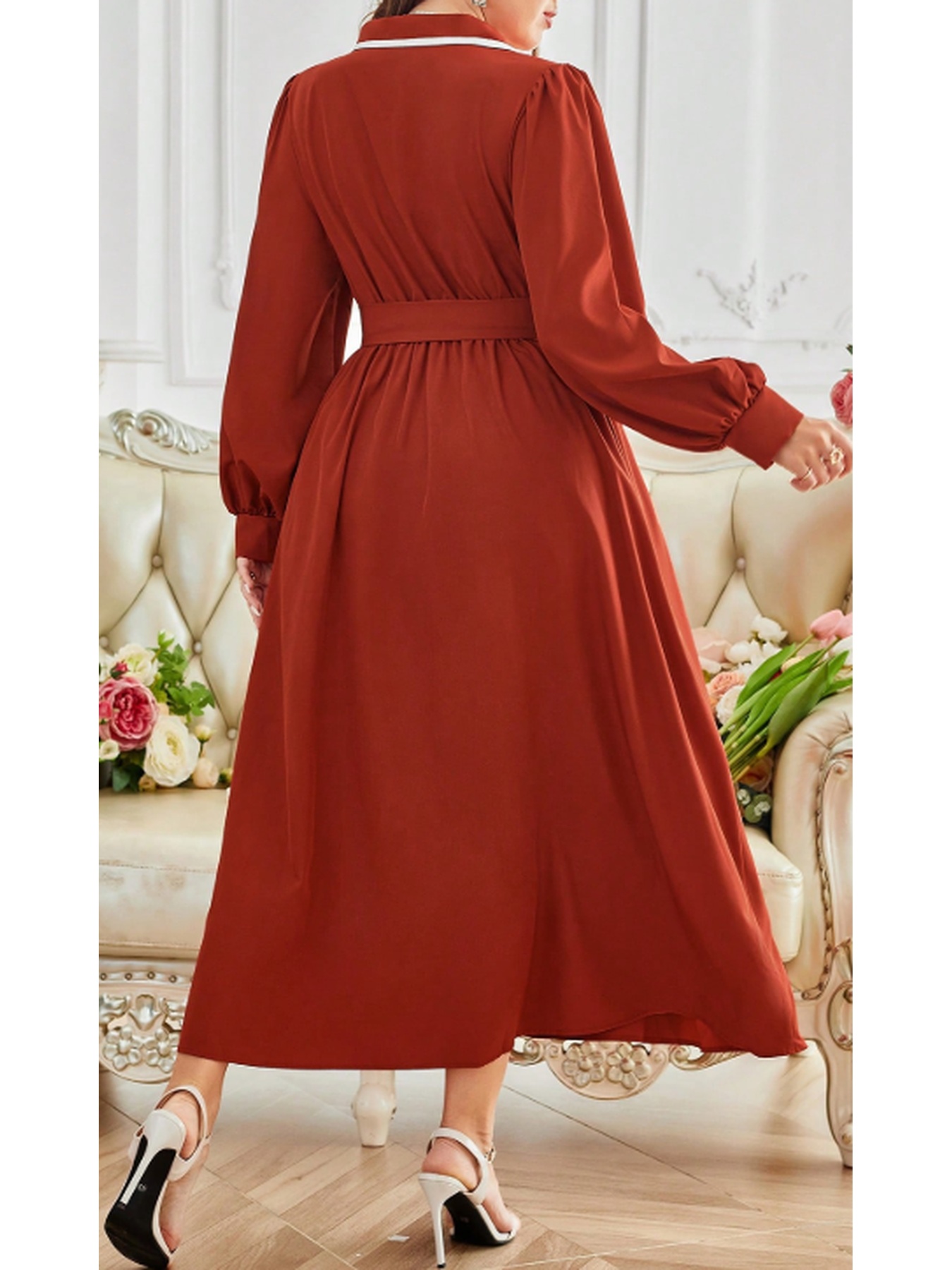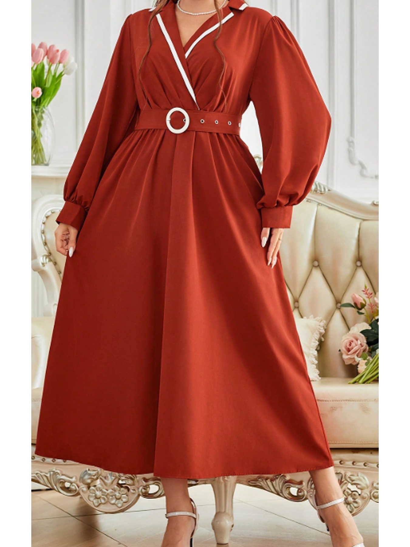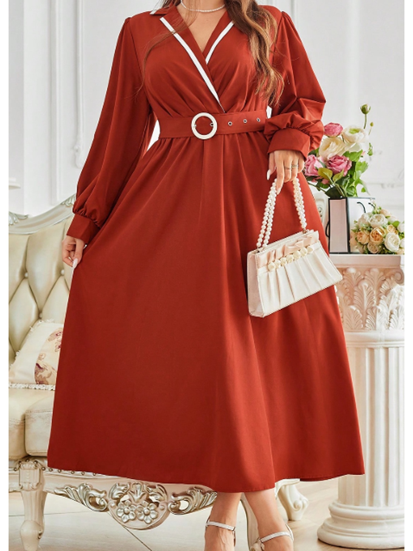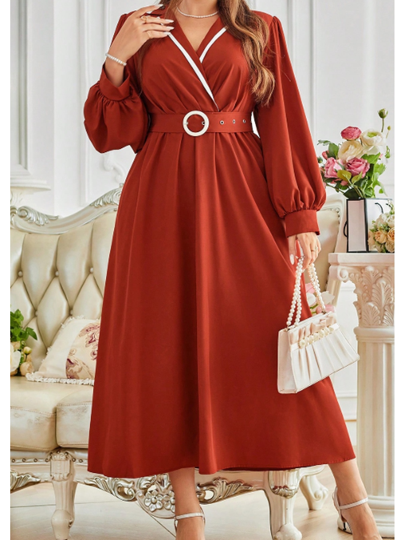 Tangerine Red Plus Size Women’s Elegant Burgundy Maxi Dress – Stand Collar, Flared Hem, Long Sleeve Formal Outfit
