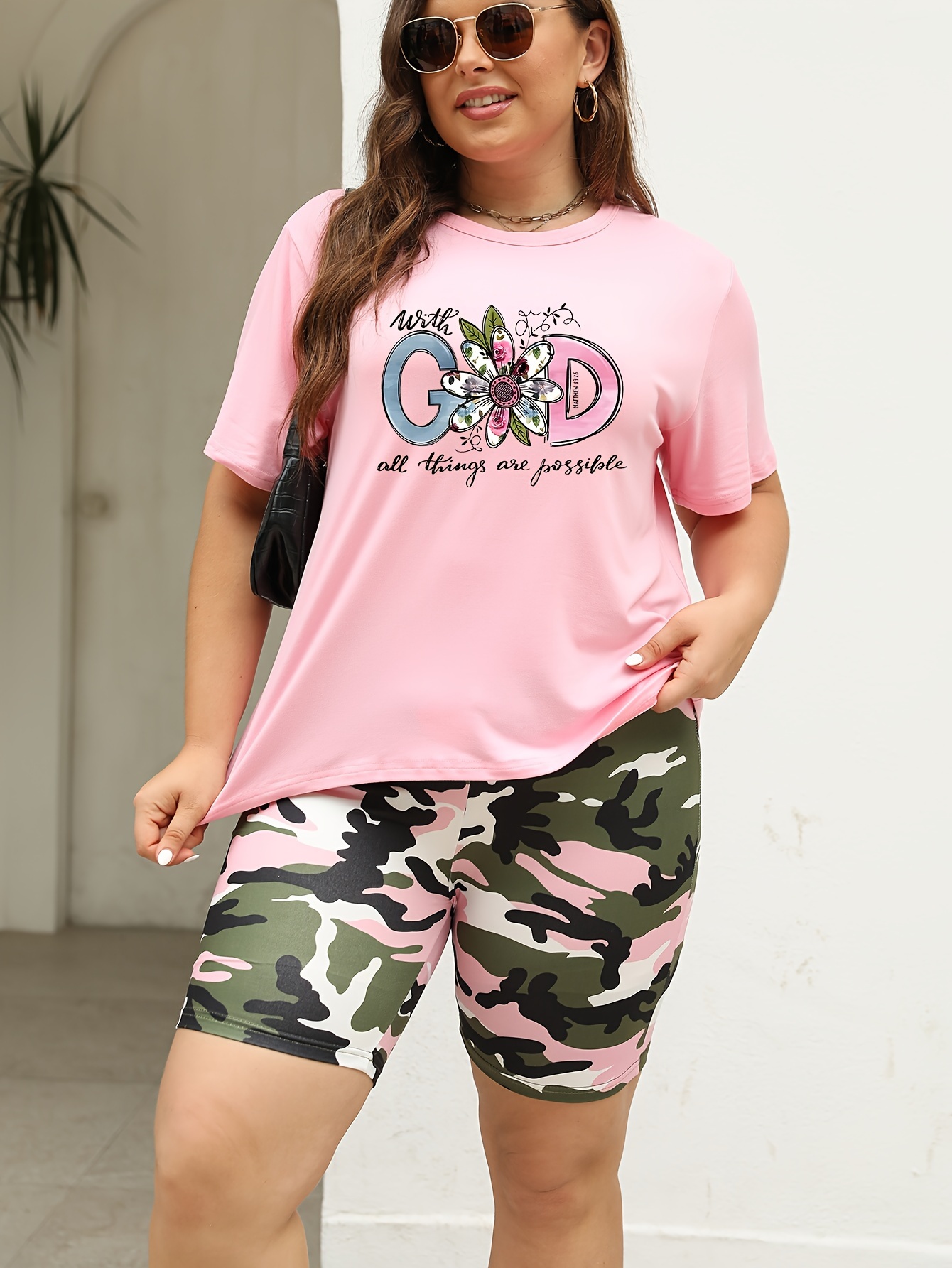 Women’s European & American Plus Size 2-Piece Sports Suit – Casual Crew Neck Top & Printed Pants, Stretchy Activewear Set