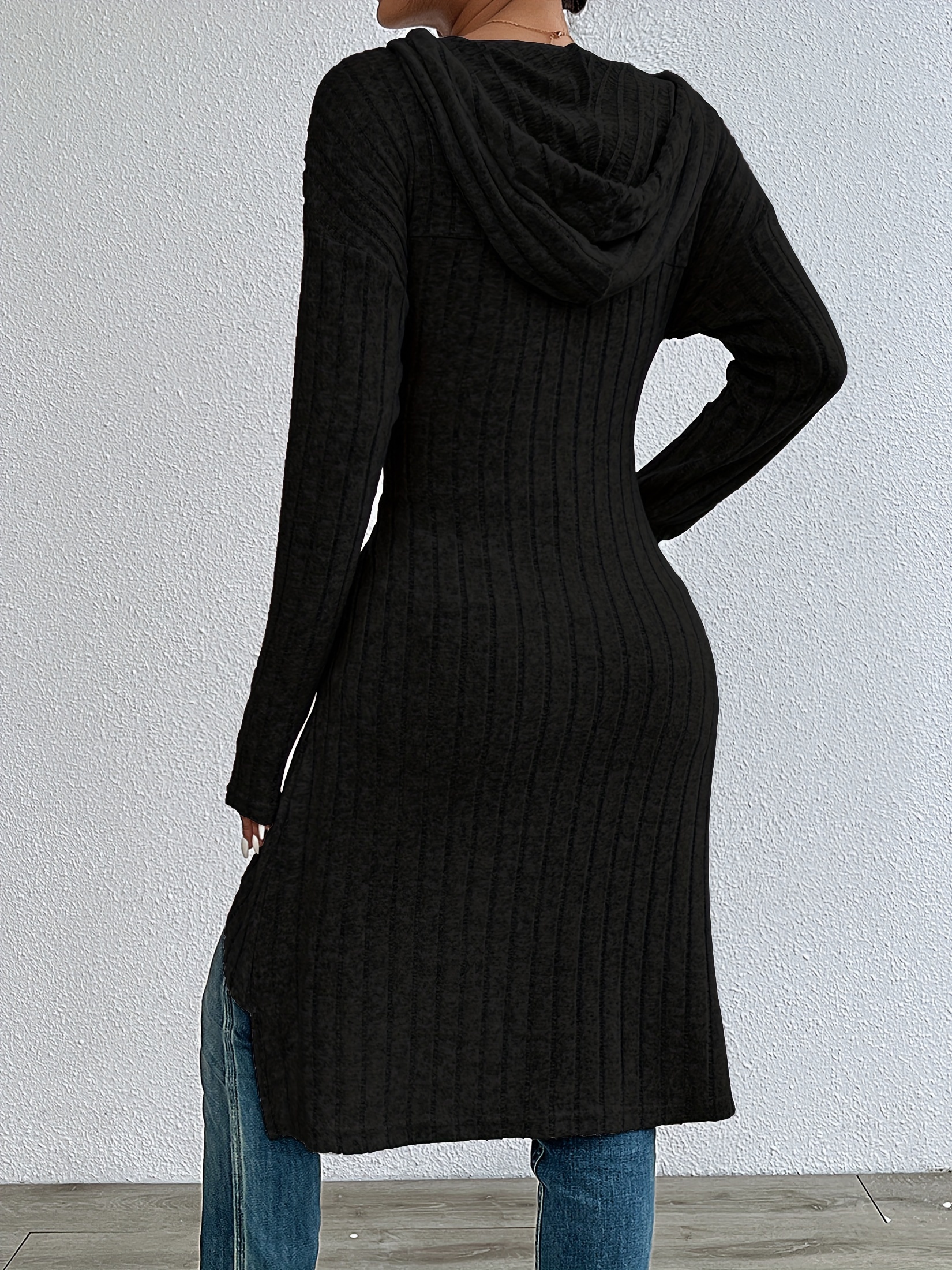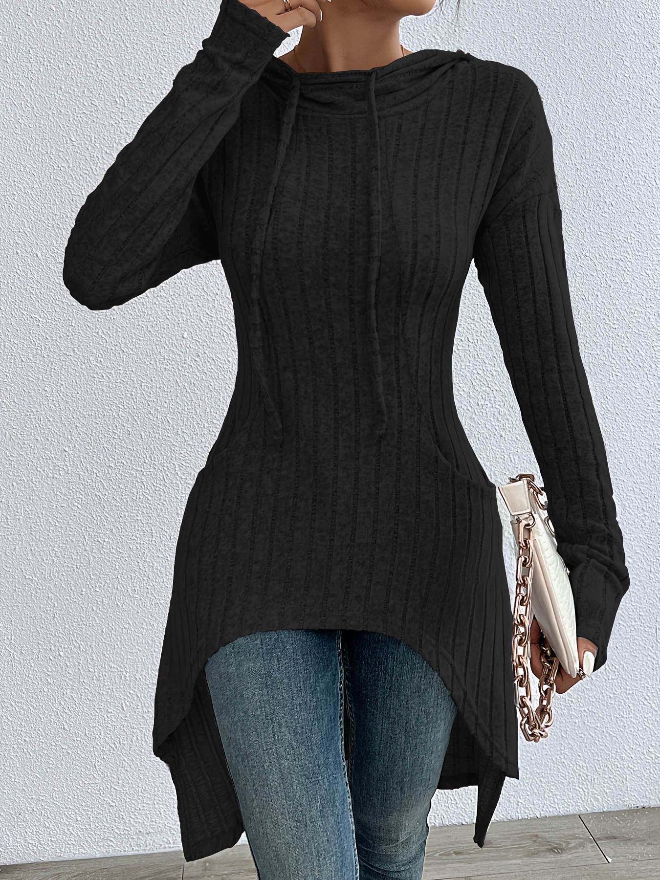 Women’S Long Black Sleeve Hooded Ribbed Sweatshirt