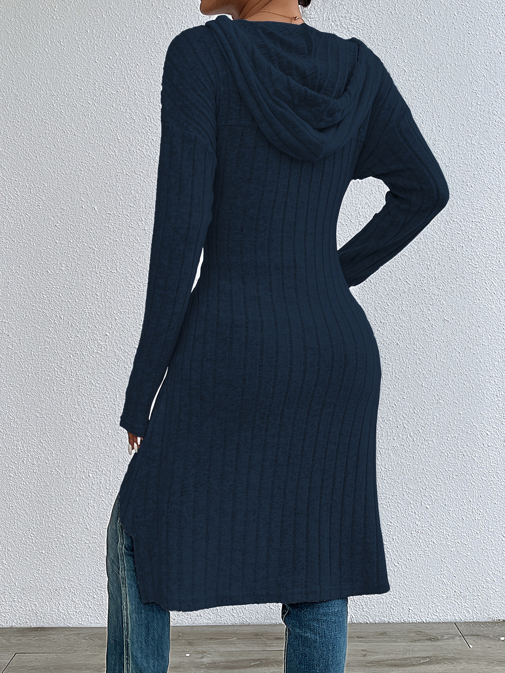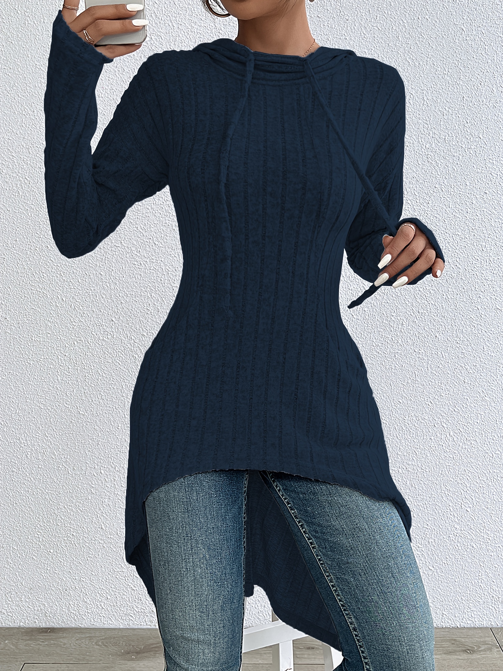 Women’S Long Navy Sleeve Hooded Ribbed Sweatshirt,