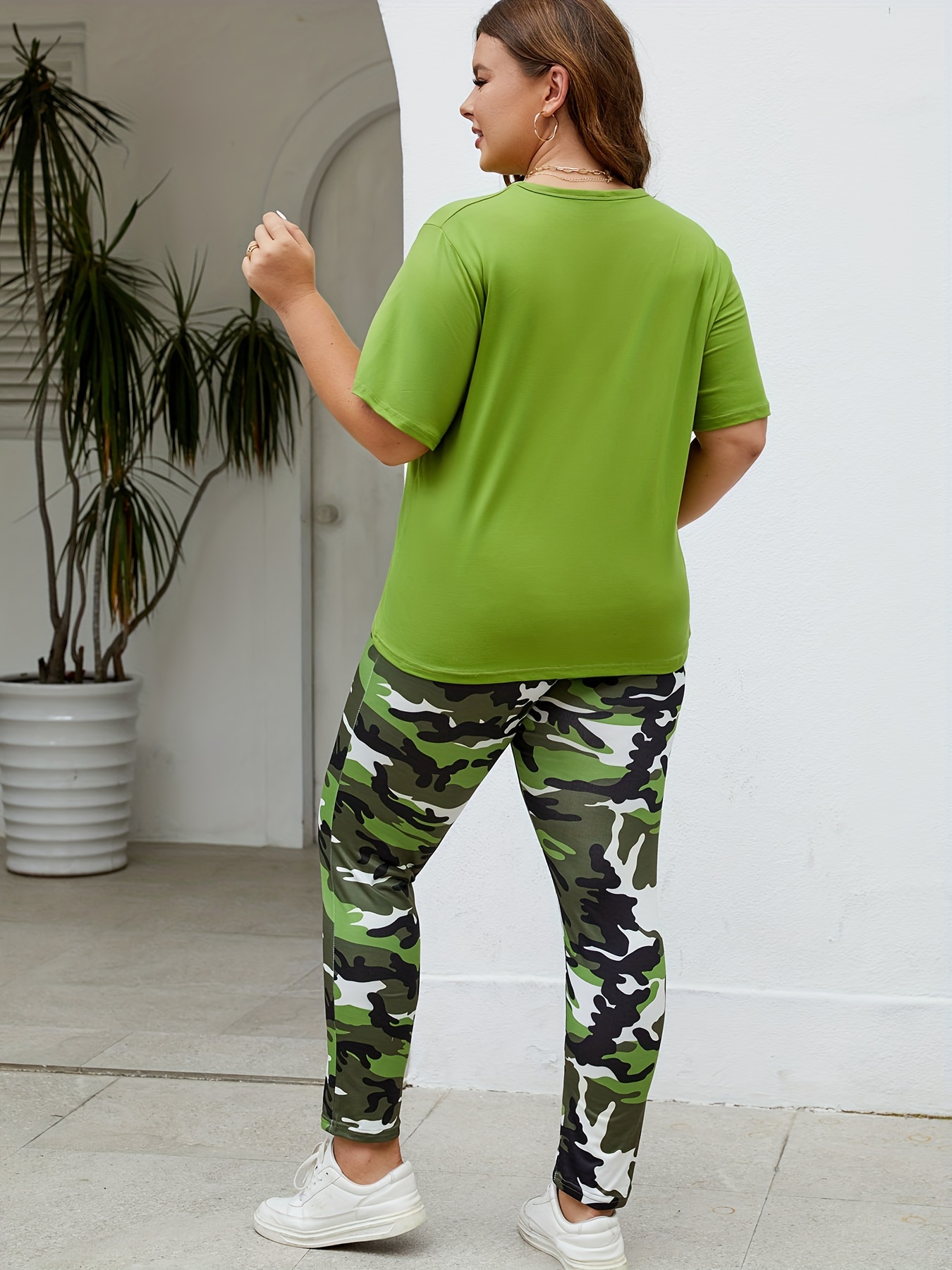 Women’s Plus Size Sportswear Set | Solid Top & Camo Pants Activewear