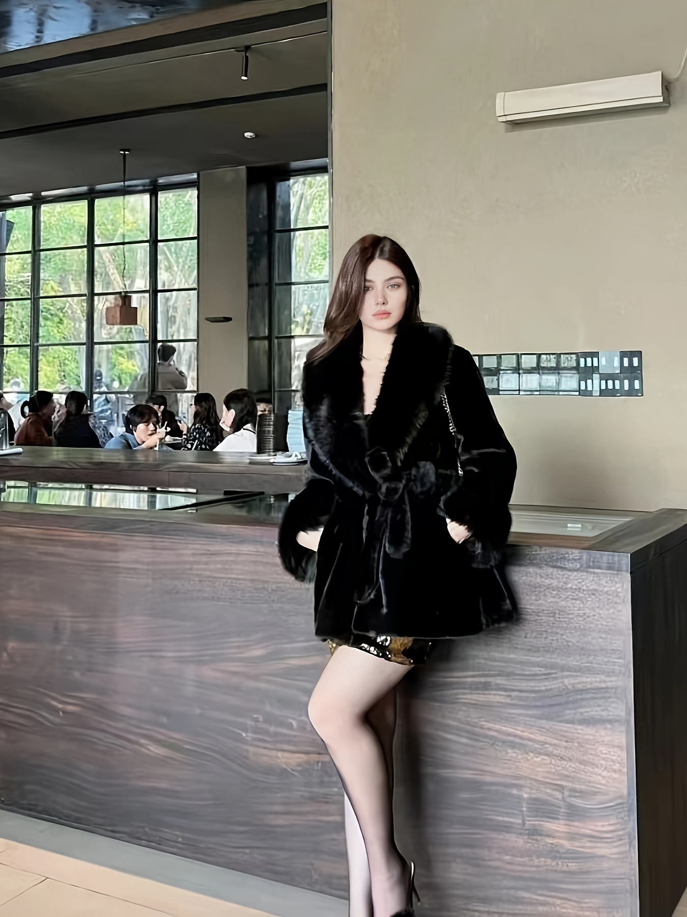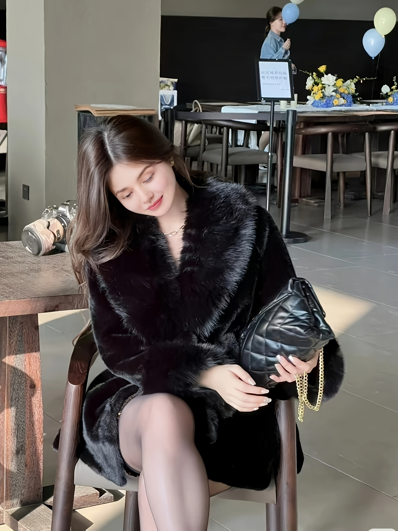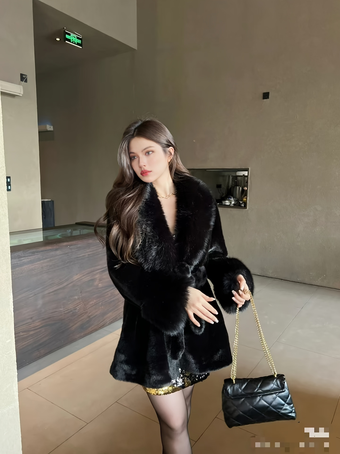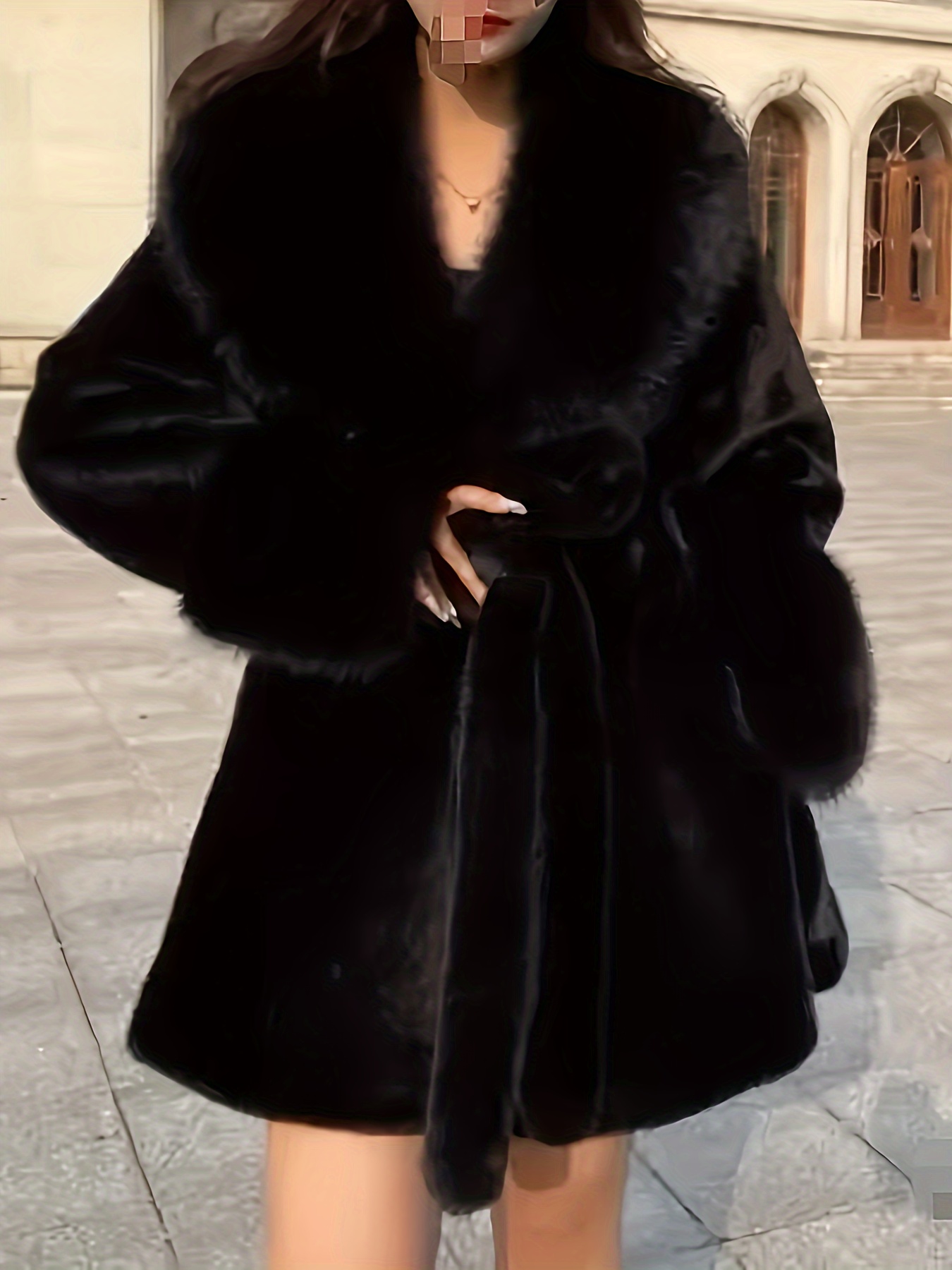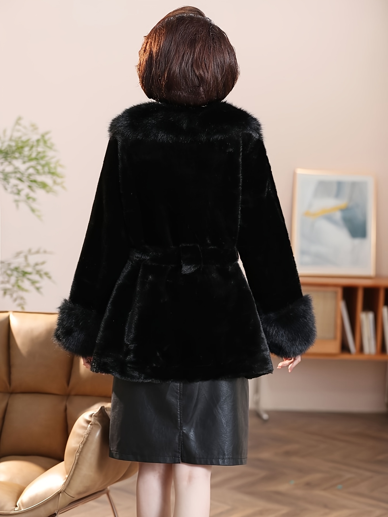 Women’s Winter Plush Faux Mink Coat – Mid-Length Hooded Belted Jacket with Fur-Lined Cuffs, Elegant Black Outerwear for Cold Weather, Dry Clean Only, Winter Jacket, Cold Weather Apparel, Folded Skirt Style, Long Sleeve Design
